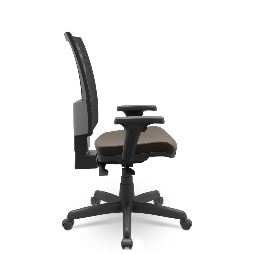 Poltrona multi regulável certificada conforme normas ABNT BR 13962 e NR17, e com 5 anos de garantia. Encosto telado com regulagem de altura e inclinação de lombar, braços reguláveis e base giratória Standard em Pu preto.