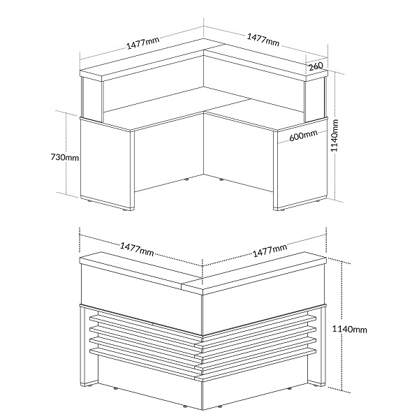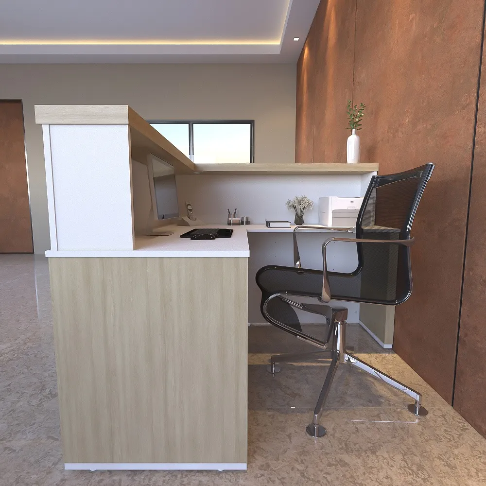 Balcão de atendimento em formato L, com tampo superior em tamburato de 50mm. Disponível nas seguintes combinações de cores: Nogal com preto ou Carvalho com branco. Valor para a cor Carvalho com Branco.