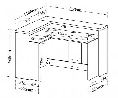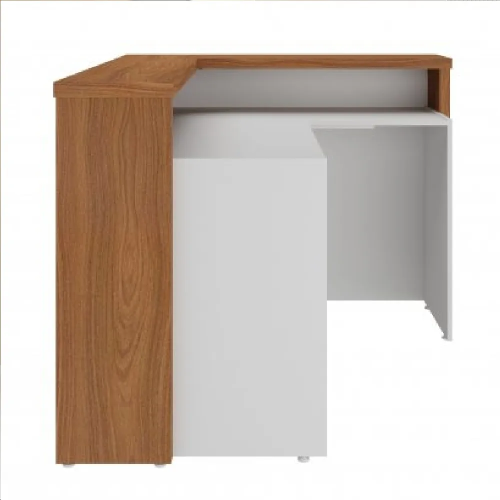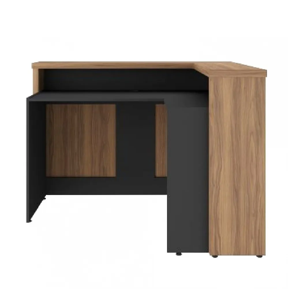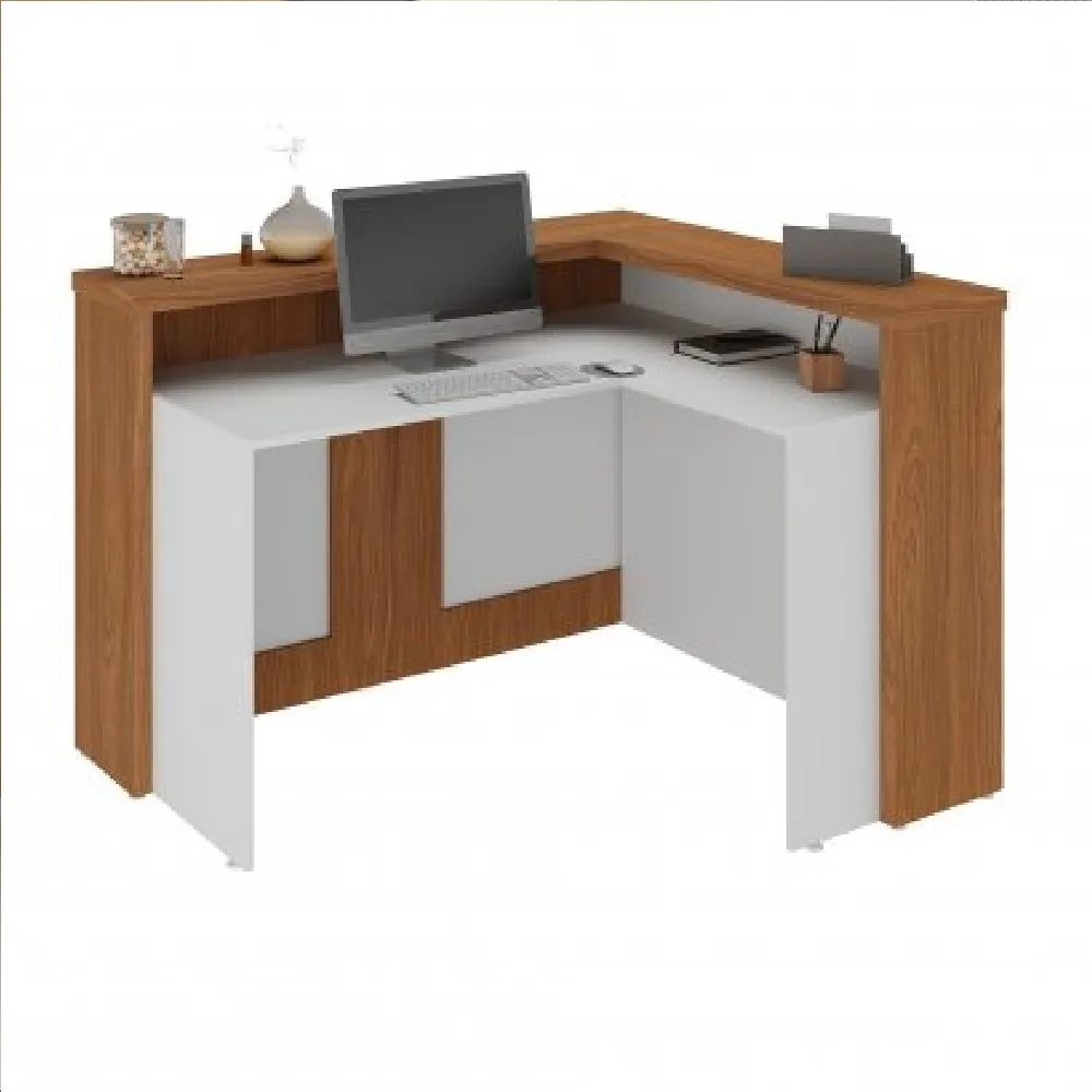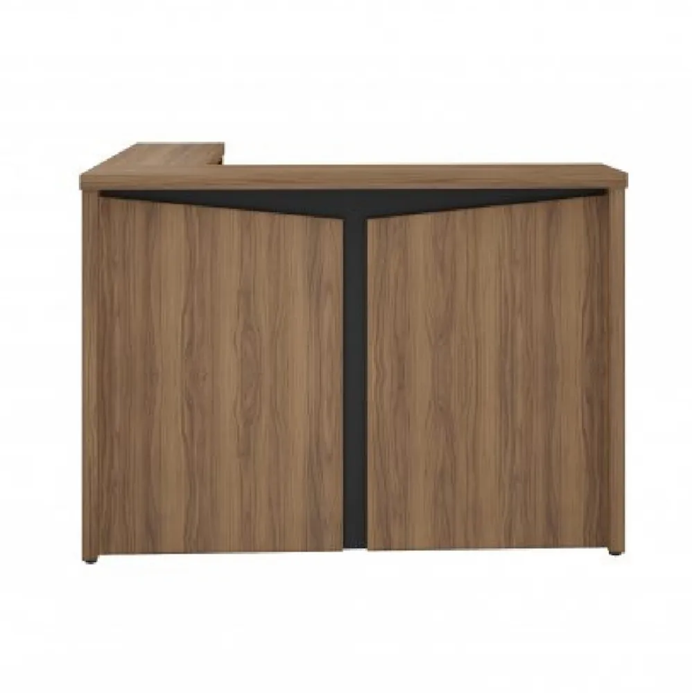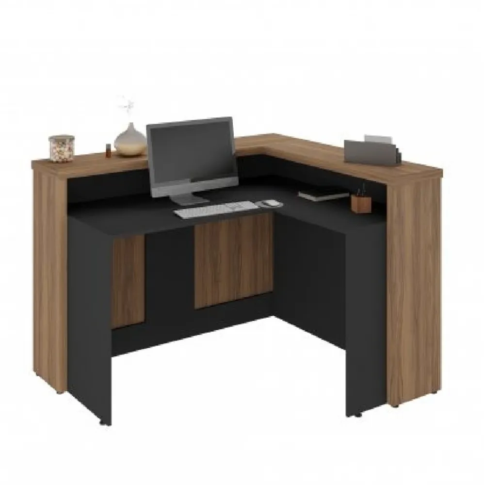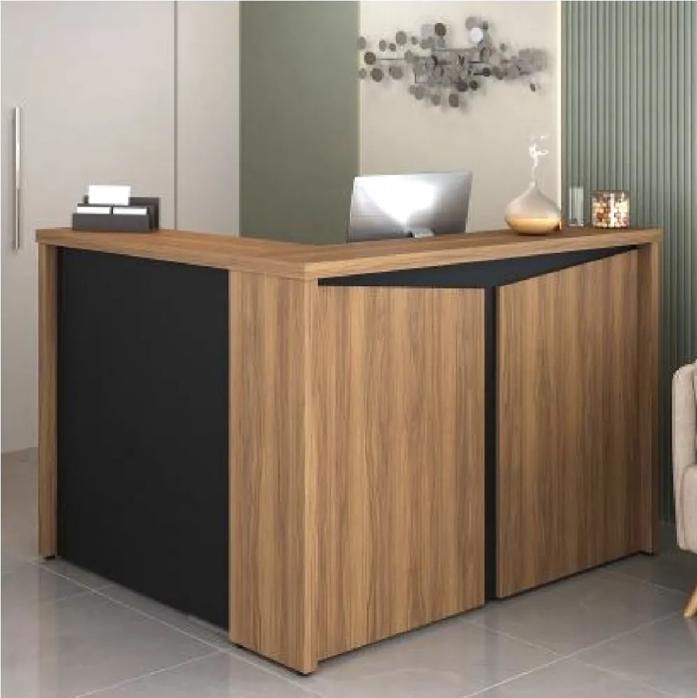 Balcão de atendimento em formato L, com tampo superior em tamburato de 37mm. Disponível nas seguintes composições de cores: Nogal com preto ou Freijó com Branco, Valor para as cores Freijó com Branco. Consulte valores para a combinação de cores Nogal com Preto.