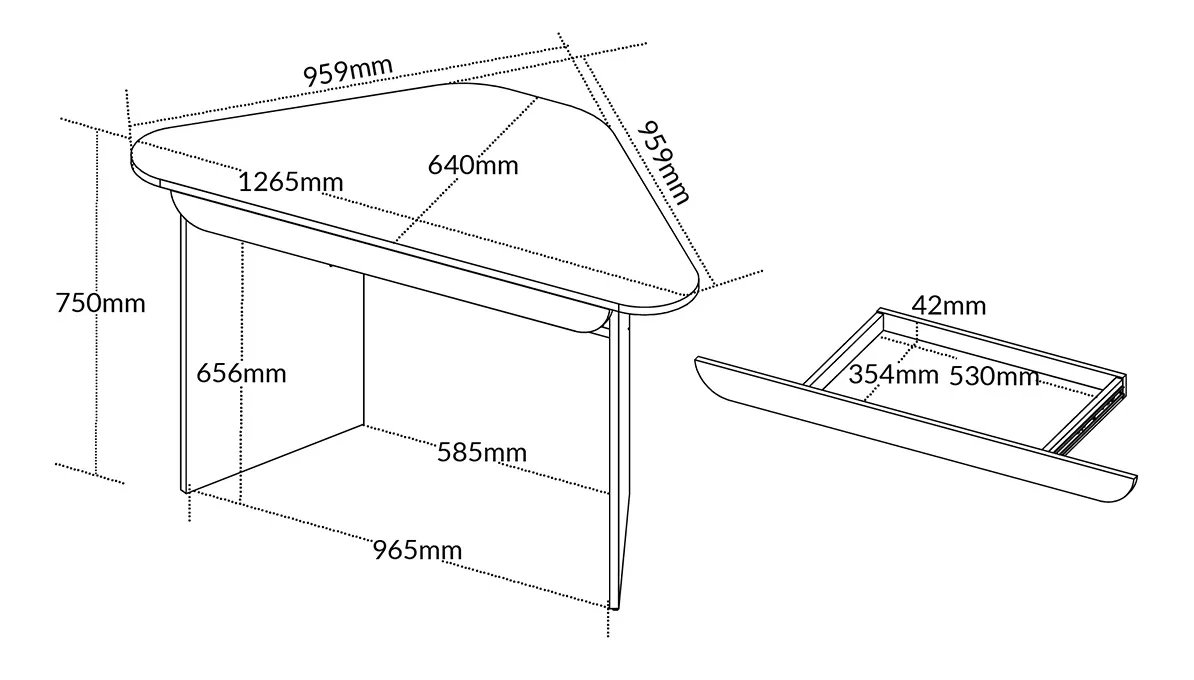 * Dimensões: L 1,265/0,959 X A 0,75. Tampo da mesa com 0,64m de profundidade.