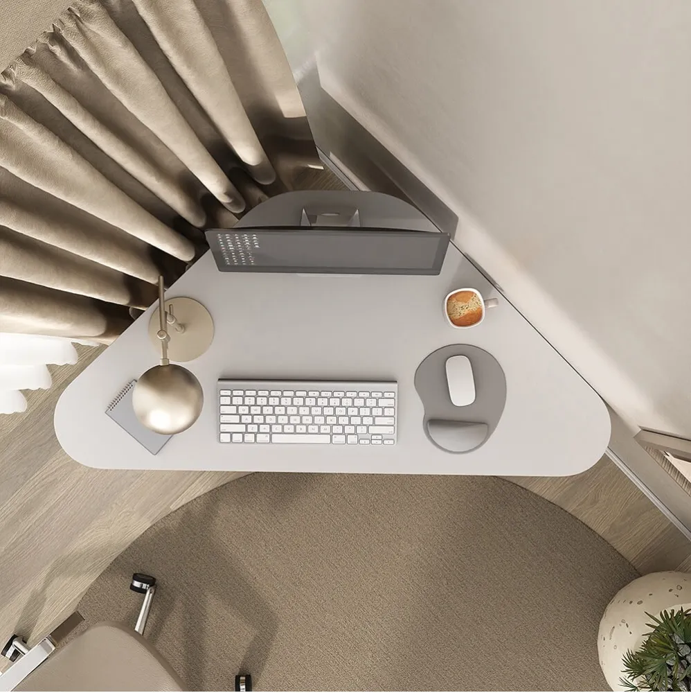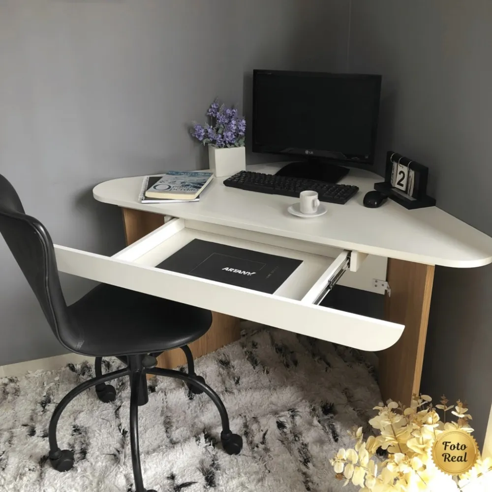Uma escrivaninha de canto é uma solução inteligente para quem busca otimizar o aproveitamento do ambiente, encaixando-se perfeitamente em cantos e proporcionando uma área de trabalho ampla, funcional e bem organizada, ideal tanto para estudos quanto para atividades profissionais.