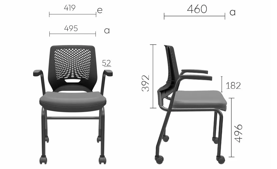 * Braços fixos em aço com acabamento em pintura na cor preta;