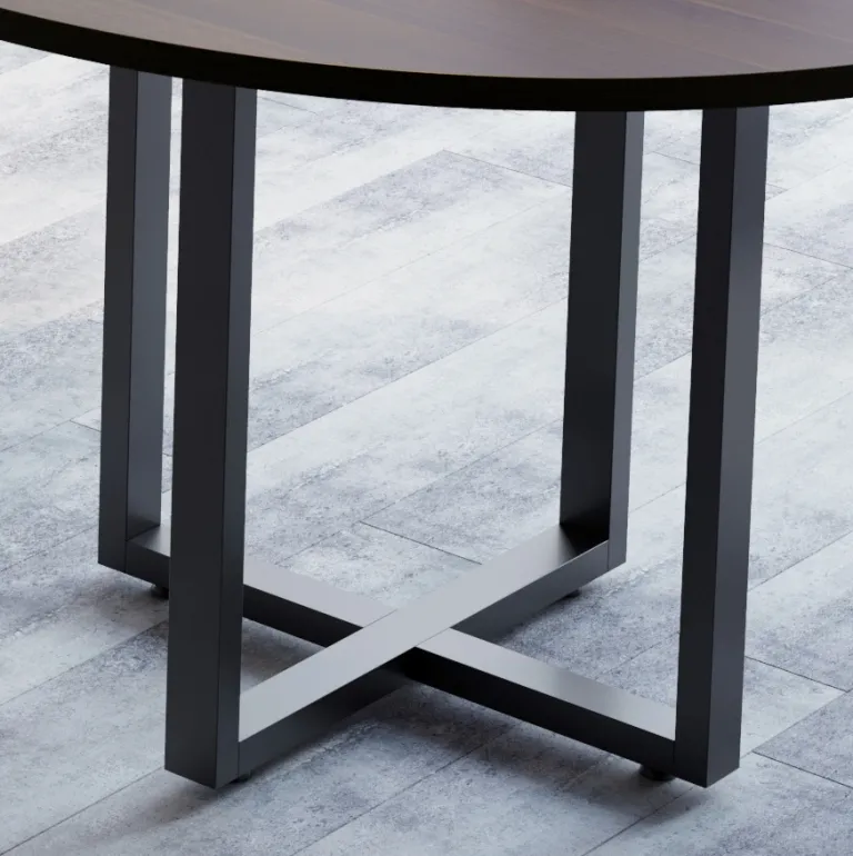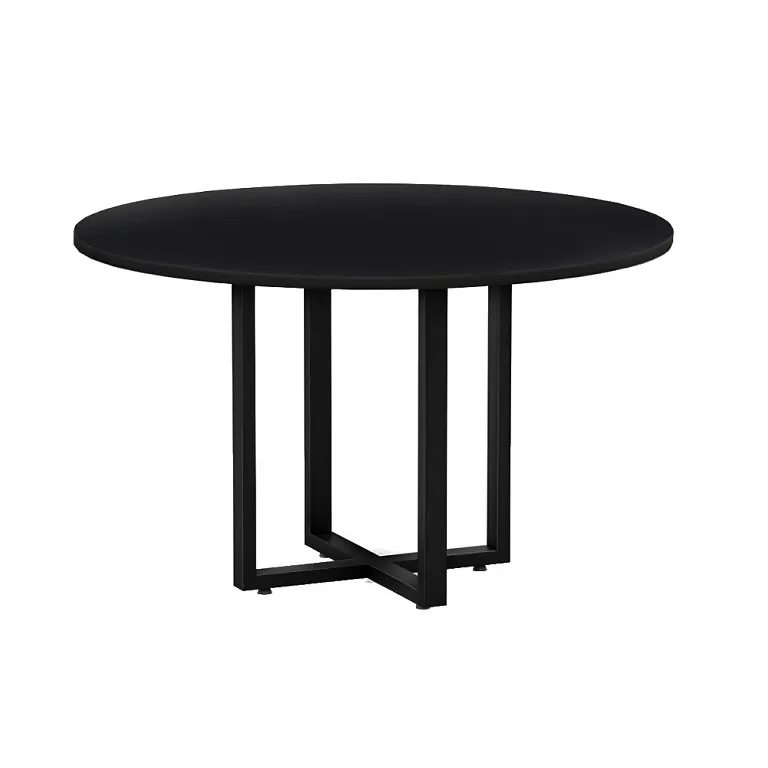 Mesa para reuniões em formato redondo com 1,20 de diâmetro. Tampo em 25mm e detalhe de pés em aço com pintura na cor preta. Tampo da mesa disponível em várias opções de cores. Valores para as cores Cinza Sagrado, Nogal, Málaga e Macadamia. Consulte outros valores para demais cores.
