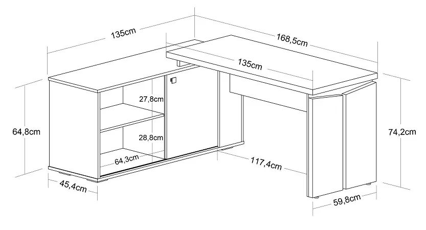 L 1,35m x A 0,75 X P 1,685. Tampo da mesa com 0,60m de profundidade.