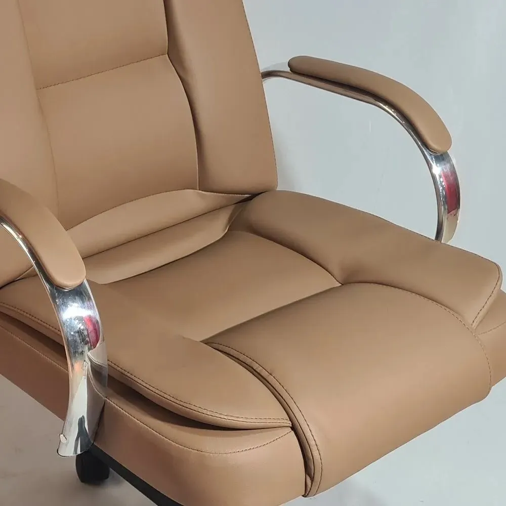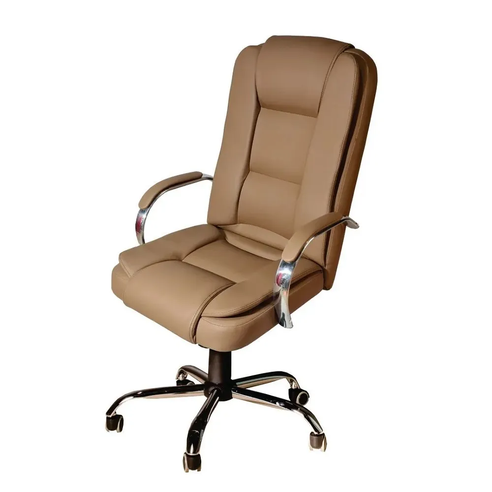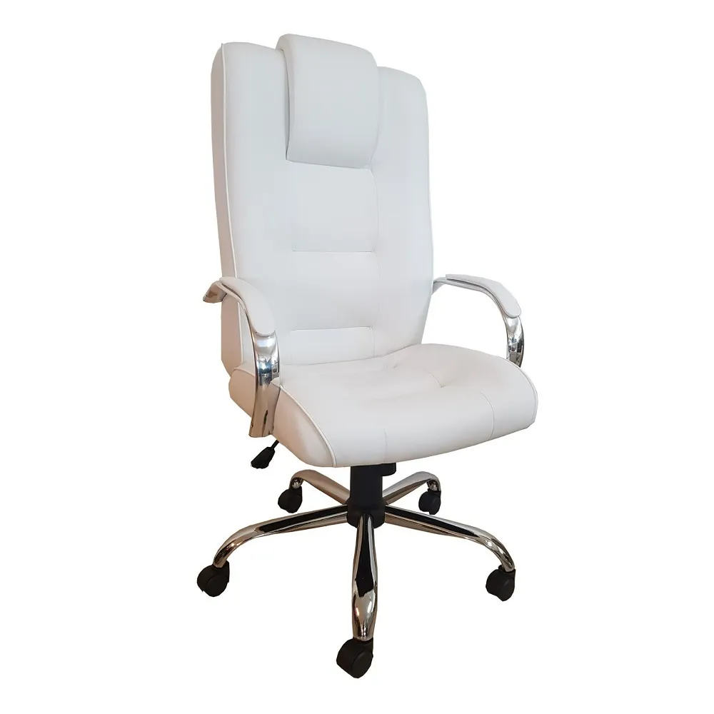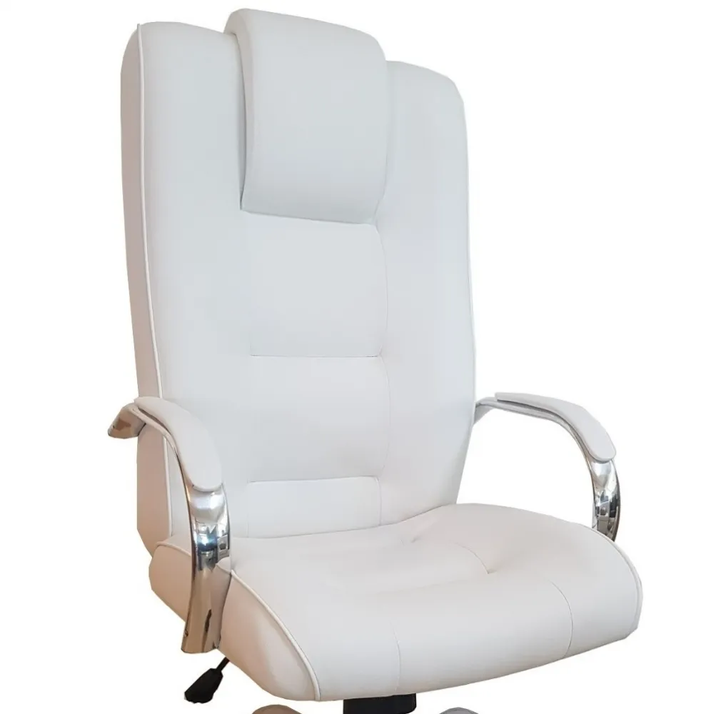 Poltrona estofada com encosto alto. Detalhes de costuras no assento e encosto. Este modelo proporciona o máximo em conforto. Possui braços em alumínio modelo Tomi com apoia braços estofado. Base giratória em aço com acabamento cromado. Revestida em couro ecológico em várias opções de cores.